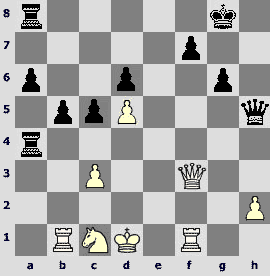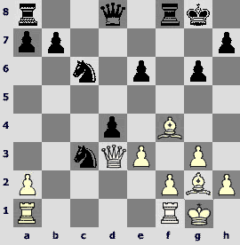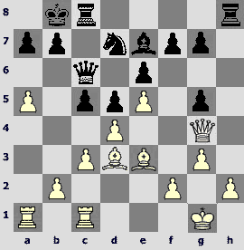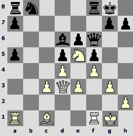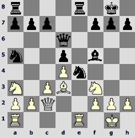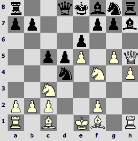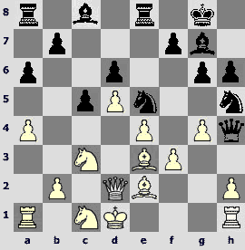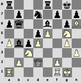 1.d4 ¤f6 2.c4 e6 3.¤c3 Ґb4 4.Јc2 d5 5.a3 Ґxc3+ 6.Јxc3 ¤e4 7.Јc2 c5 8.dxc5 ¤c6 9.cxd5 exd5 10.¤f3 Ґf5 11.b4 d4. The opponents play one of the sharpest variations of the Nimzo-Indian that has come into fashion after the game Kramnik – Anand (Dortmund 1999).