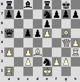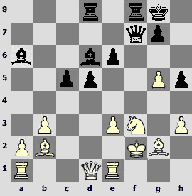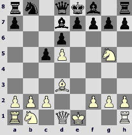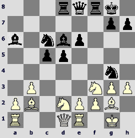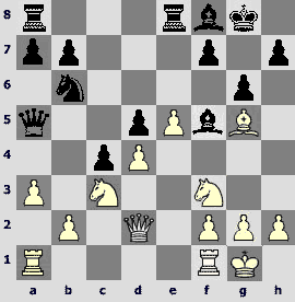 1.d4 ¤f6 2.c4 e6 3.¤c3 Ґb4 4.¤f3 d5 5.cxd5 exd5 6.Ґg5 ¤bd7 7.e3 c5 8.Ґd3 Јa5 9.Јc2 c4 10.Ґf5 O-O 11.O-Og6 12.Ґxd7 ¤xd7 13.e4 ¤b6 14.e5 Ґf5 15.Јd2 ¦fe8 16.a3 Ґf8