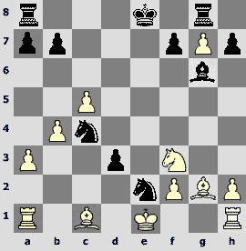 9.f3 ¤xc3 10.bxc3 Ґd6 11.f4 O-O 12.O-O b6 13.a4 Ґa6 14.cxd5 Ґxd3 15.Јxd3 cxd5 16.a5. One can assert that Black's opening experiment didn't justify itself. There are serious problems with the development of the b8-knight and the pawn structure leaves much to be desired.