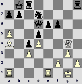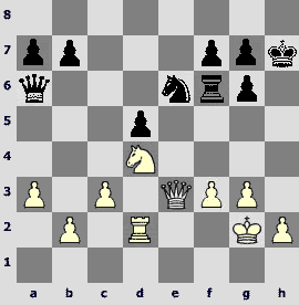 1.e4 c5 2.¤f3 d6 3.d4 cxd4 4.¤xd4 ¤f6 5.¤c3 a6 6.Ґe3 e5 7.¤b3 Ґe6 8.f3 Ґe7 9.Јd2 O-O 10.O-O-O ¤bd7 11.g4 Јc7 12.g5 ¤h5 13.ўb1 b5 14.¤d5 Ґxd5 15.exd5 ¤b6 16.¤a5. A topical pawn sacrifice in the popular variation. To be honest, recently White played 16.¦g1 more often.