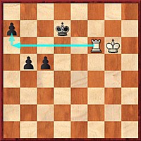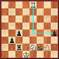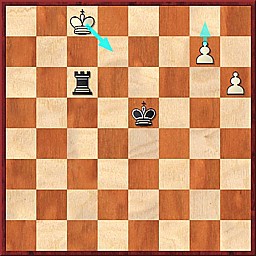 72.Kg3? Выигрывал шах ладьей, чтобы вытеснить черного короля на линию "b" – 72.Ra1+! Kb5 (или 72...Kb4 73.Rh1 b2 74.h6 Rf8+ 75.Kg3+–) 73.Rh1! Kc4 74.h6 b2 75.g5 Kd5 76.Rb1+–. Теперь Бронштейн создает маленький этюд: