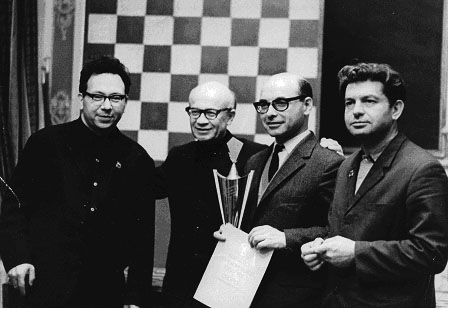Александр Маркович Константинопольский с учениками – Абрам Хасин, Давид Бронштейн с Кубком СССР, Ханан Мучник, 1970