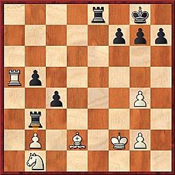 32...h6. Этот ход понять трудно. Что мешало черным перейти в решающее наступление? Выигрывало 32...c3 33.bxc3 Qxc3 34.Rf7 d3–+. Хорошо и 32...d3 33.Nb4 Be6, не пуская ладью на f7. Положение белых было бы весьма плачевным.