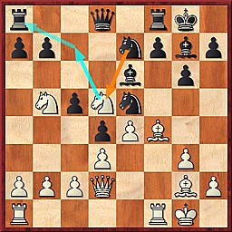 13...Qe8. Не очень удачный ответ, рассчитанный только на 14.Qh5, чтобы после 14...h6 15.Nh3 сыграть 15...f5.
