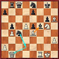 14.Qg4 a4? Самоубийственный ляпсус, свидетельствующий о полной неготовности Ульмана. Необходимо было 14...Kh8 15.Qh5 h6 16.Nh2 Nd4.