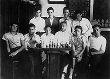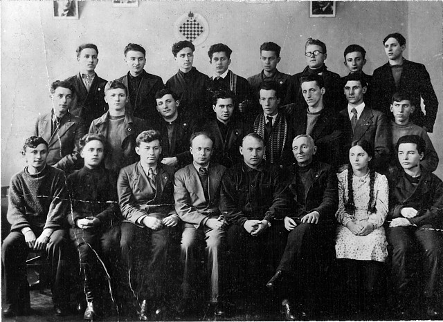 Ученики и руководители первого в СССР детского шахматного клуба. Фотография 1940 года из архива Любови Иезекиилевны Якир, отличающаяся большей четкостью, чем аналогичный снимок из архива И.Купермана.