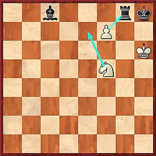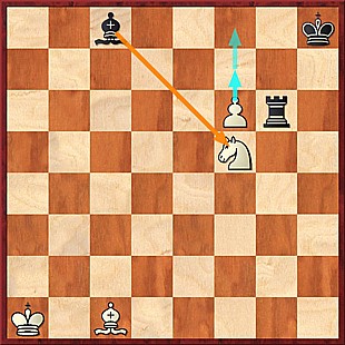 1.f7 Ra6+ 2.Ba3! Rxa3+ 3.Kb2 Ra2+ 4.Kc1 Ra1+ 5.Kd2 Ra2+ 6.Ke3 Ra3+ 7.Kf4 Ra4+ 8.Kg5 Rg4+ 9.Kh6 Rg8. Пока все ходы были вынуждены, а здесь решает тихий и удивительно красивый маневр: